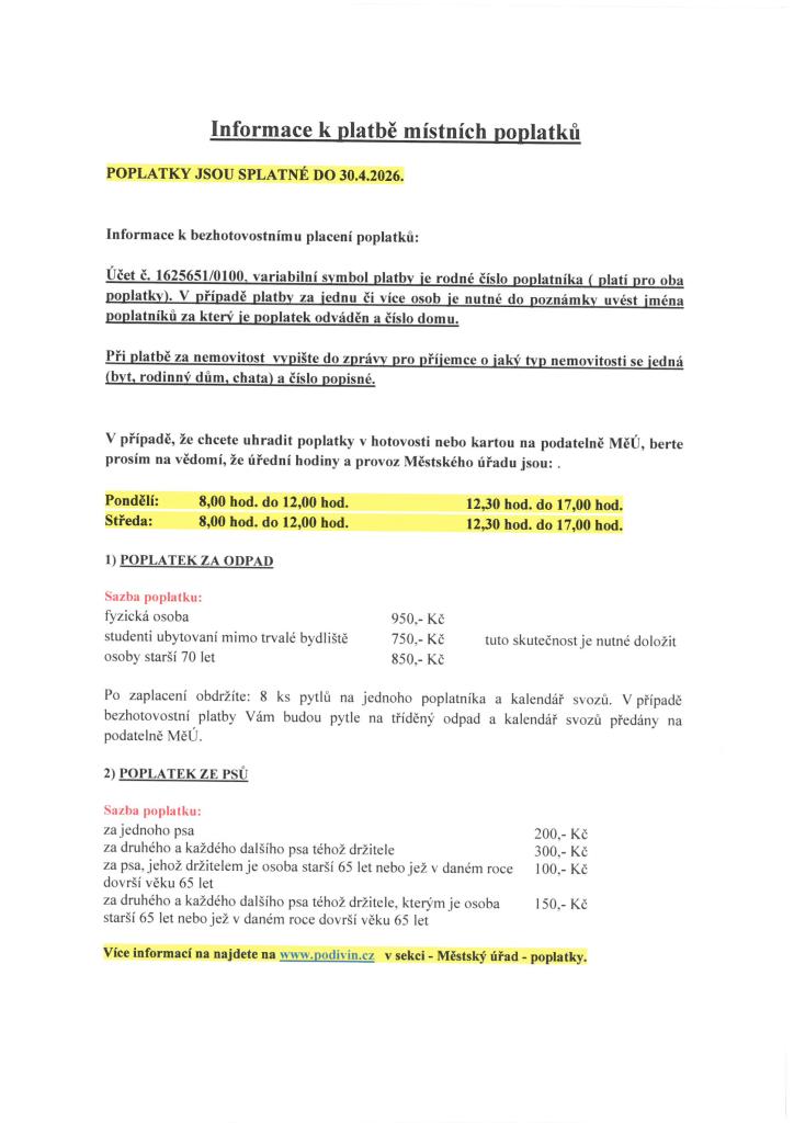 Informace o úhradě místního poplatku za obecní systém odpadového hospodářství a poplatku ze psů v roce 2026.