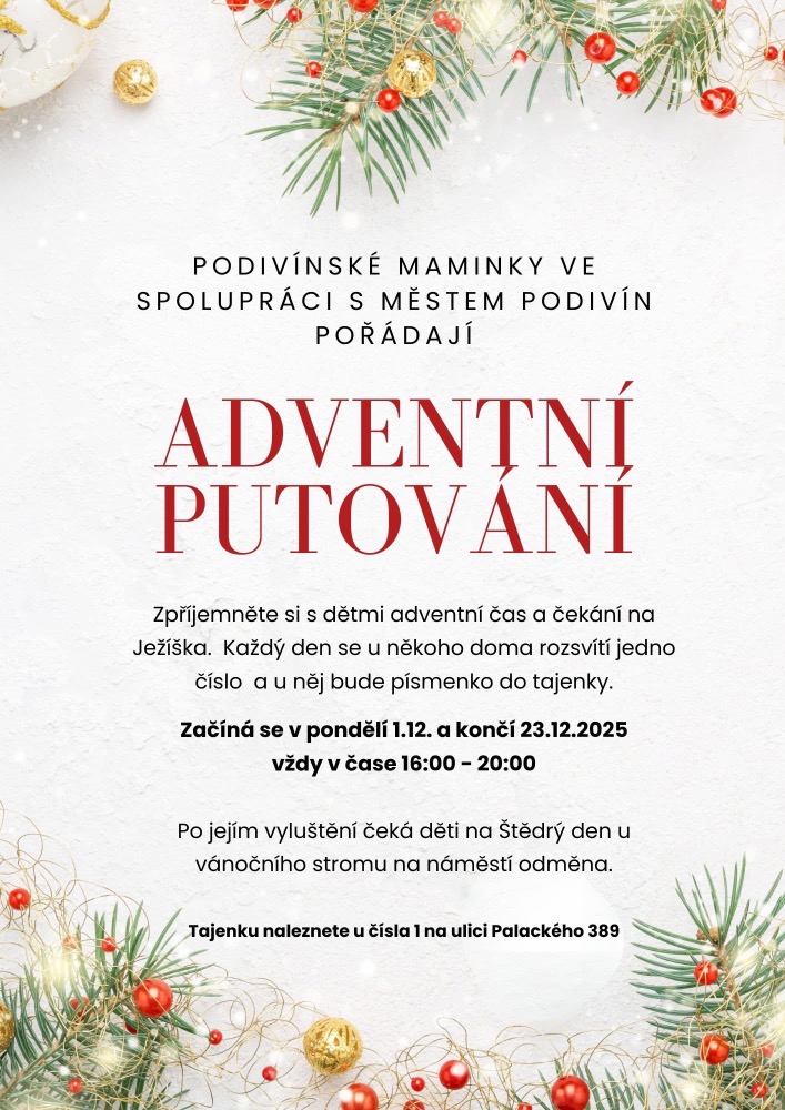 Podivínské maminky ve spolupráci s Městem Podivín pořádají Adventní putování. Každý den mezi 1. a 23. prosincem vždy v čase od 16,00 do 20,00 hod. se u někoho doma rozsvítí jedno číslo a u něj bude písmenko do tajenky. Po jejím vyluštění čeká děti na Štědrý den u vánočního stromu na náměstí odměna.