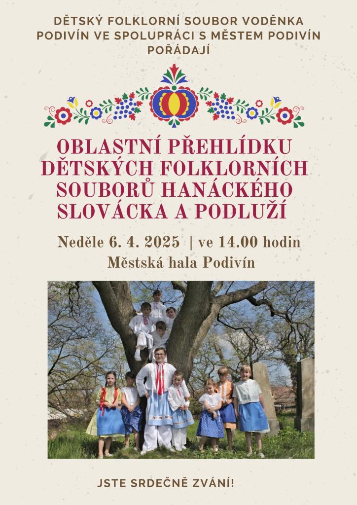Dětský folklorní soubor Voděnka a město Podivín pořádají oblastní přehlídku dětských folklorních souborů Hanáckého Slovácka a Podluží v neděli 6.4.2025 ve 14,00 hod. v Městské hale Podivín.