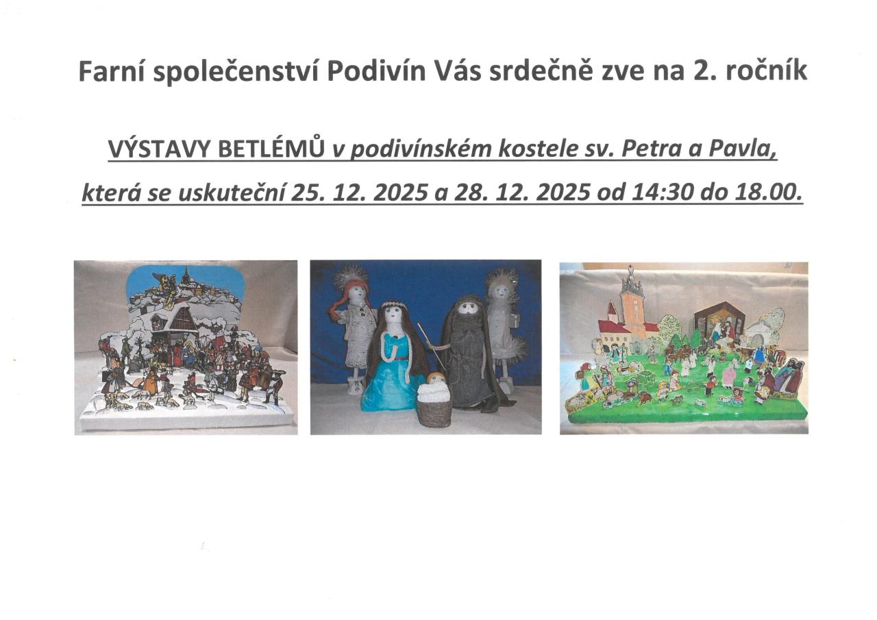 Farní společenství Podivín Vás zve na výstavu betlémů, která se uskuteční 25.12. a 28.12. od 14,30 do 18,00 hod. v podivínském kostele sv. Petra a Pavla.